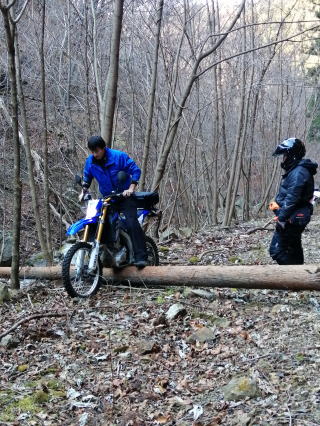 道路の途中に丸太が・・・ 宮本WR250はシャコタンなので亀の子状態・・・ onemake.jp林道チームはフルサイズの車両が多く足場が悪いと簡単にコケる・・・ |